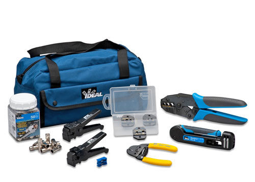 The Ideal 33-410 also includes a 2- & 3-step stripper (with extra 3-step replacement blade), Data T cutter and 50ea RG6 compression F connectors (Reg/Tri/Quad). Contents organized in a zippered mechanics bag.